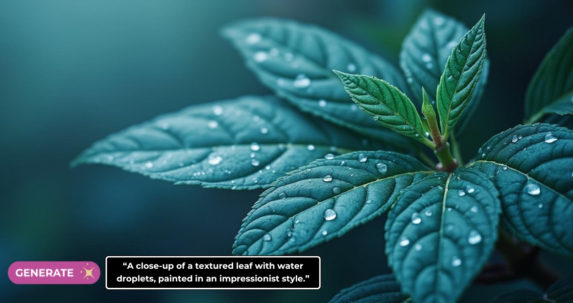 “A close-up of a textured leaf with water droplets, painted in an impressionist style.”