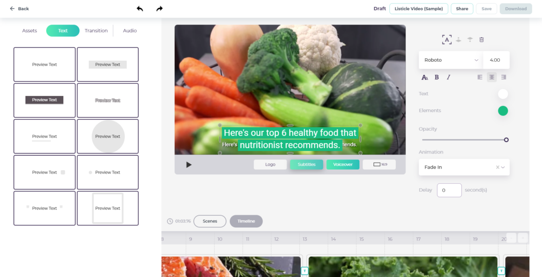 Una caratteristica fondamentale per tutti gli editor video online è un buon strumento per i sottotitoli. Videomaker porta proprio questo aspetto a un altro livello. Questa funzione genera automaticamente i sottotitoli per i contenuti video, rendendo più facile per gli spettatori seguire e comprendere il contenuto. I sottotitoli sono particolarmente utili per le aziende che creano contenuti per un pubblico che non necessariamente parla la stessa lingua del content creator. Inoltre, Videomaker offre anche un’ampia gamma di stili di font ed effetti per dare ai sottotitoli dei video quel fattore “wow” in più per impressionare la audience.