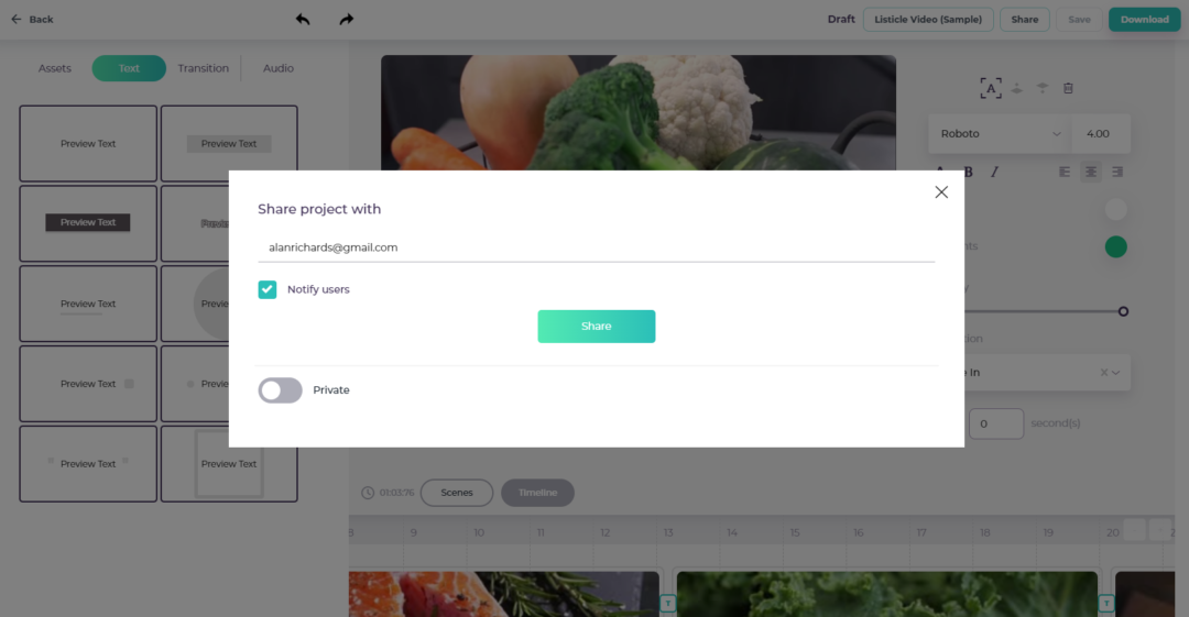 Infine, la funzione di condivisione di Videomaker consente ai team di lavorare insieme allo stesso progetto in modo semplice e simultaneo. Con questa funzionalità, gli utenti possono facilmente condividere i progetti con i membri del team, consentendo collaborazione e feedback in tempo reale. La maggior parte degli editor video online sembra trascurare questo aspetto, che aiuta a snellire il processo di creazione dei contenuti e a garantire che tutti siano sempre sulla stessa lunghezza d’onda per ottimizzare i risultati.