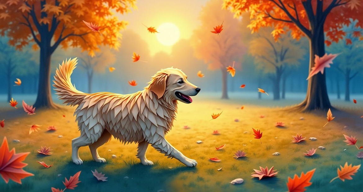 “A golden retriever playing in a park during autumn, with colourful leaves falling and a sunset in the background, painted in a watercolour style.”