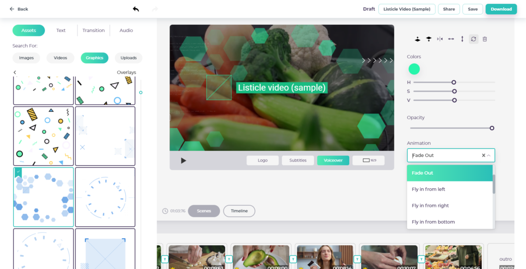Le animazioni e le transizioni sono un aspetto fondamentale dell’editing per tutti i tipi di contenuti video. Per la maggior parte degli editor video, creare transizioni ed effetti animati può essere un compito noioso. Videomaker, invece, permette agli utenti di creare animazioni uniche e d’impatto in pochi clic, con un’ampia gamma di opzioni personalizzabili. Grazie alle integrazioni delle animazioni dinamiche di Lottiefiles, Videomaker può aggiungere un tocco speciale a tutti i tipi di contenuti, sia che si tratti di creare video esplicativi, demo di prodotti o contenuti di marketing. Animando testo, immagini e altri elementi visivi, gli utenti possono creare filmati in grado di catturare l’attenzione del pubblico e che risultano al tempo stesso visivamente accattivanti ed efficaci.